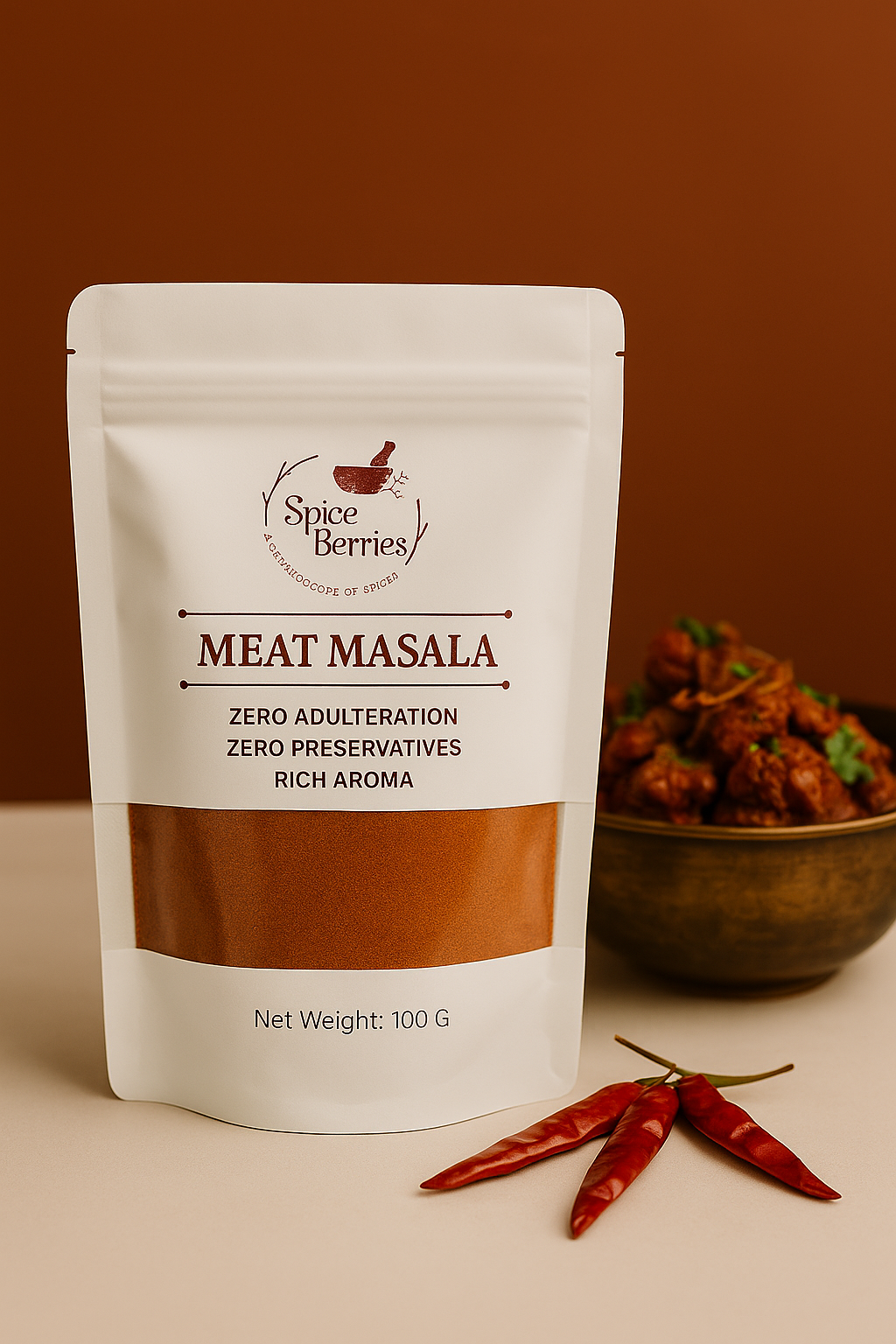 SpiceBerries Meat Masala is a bold, aromatic blend of 100% natural spices—perfect for mutton, beef, chicken, and roast dishes. Adds deep, traditional flavor to every meat recipe. No additives or preservatives.