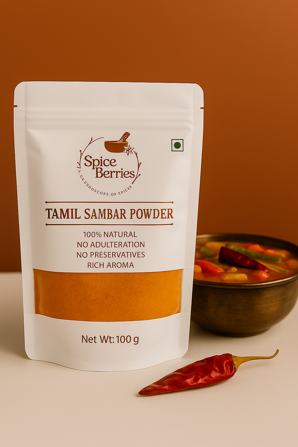 Bring home the taste of traditional Tamil kitchens with SpiceBerries Tamil Sambar Powder β a handcrafted blend of roasted lentils, red chillies, coriander, cumin, fenugreek, and aromatic spices. Carefully ground to perfection, this flavorful masala infuses your sambar with rich aroma, balanced spice, and authentic Tamil Nadu-style taste.